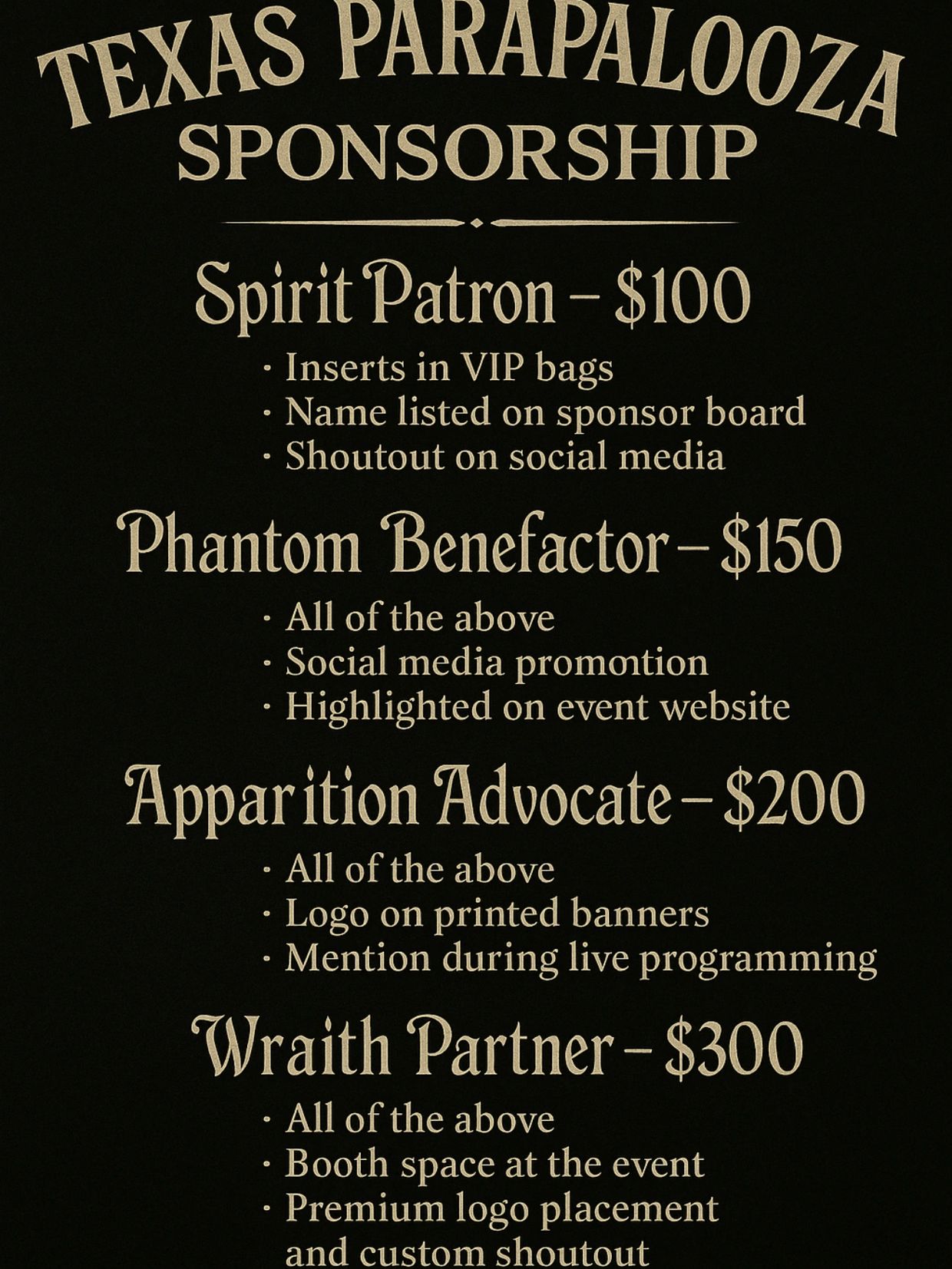 Join us for Texas ParaPalooza, an immersive two-day celebration of all things paranormal—held at locations that set the stage for a chillingly unforgettable event, and your sponsorship helps us bring it to life.